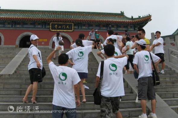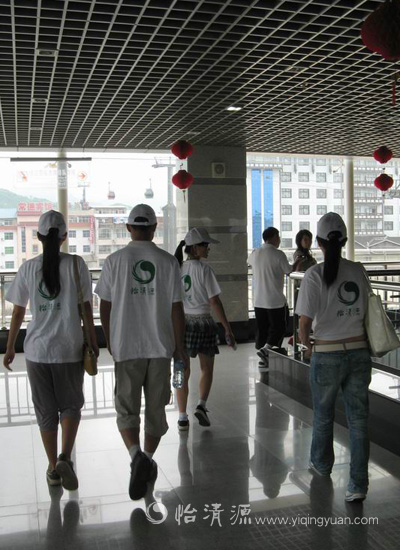 工作人员身着印有怡清源标识的文化衫,预备坐上山缆车